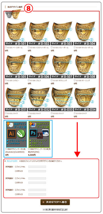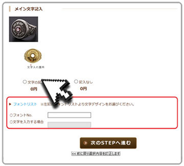 次に下の□枠の部分で文字とフォントを入力下さい。デザインにより、文字の設置数が変わります。
