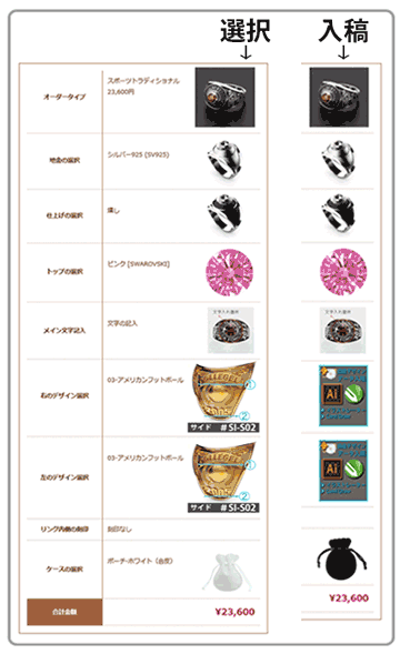 サイドの「デザイン選択」の場合と「デザイン入稿」にした場合左記のようになります。
