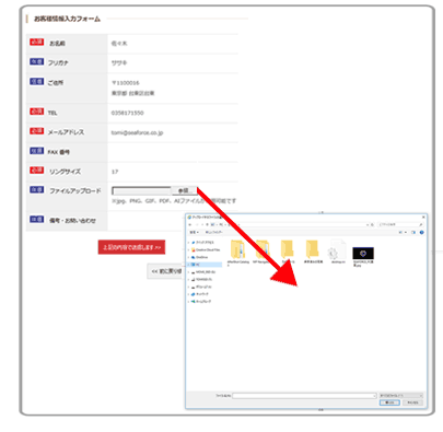 【Ai/Psデータの添付入稿の方法】 ファイルアップロード欄からファイルを参照し添付して下さい。 ※aiデータを添付入稿する場合は必ずインターネットエクスプローラーからご注文を行って下さいませ。