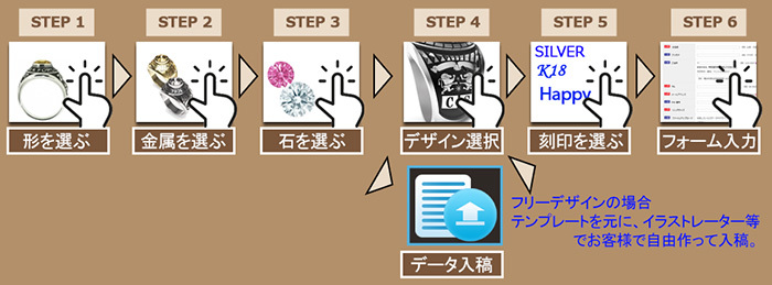 金属を選んで、文字やメッセージ、石、サイドのデザインを選択するだけ!